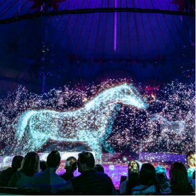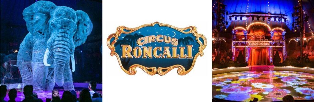 Einzige tierische Akteure der Show im „1. Tierschützer-Zirkus der Welt“ kommen aus der Holographietechnik , denn Roncalli verzichtet bewusst auf echte Tiere und ist seit 2018 nicht nur gänzlich plastik- sondern auch komplett tierfrei. Stattdessen tanzen in der Zirkusmanege virtuelle Pferde, große schwebende Fische und ein beeindruckender Elefant.